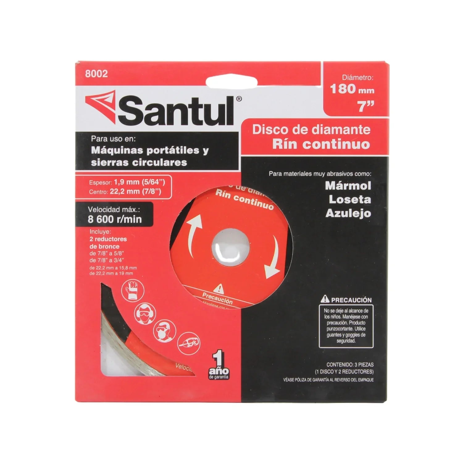 Disco diamantado Santul modelo 8002 de 7" con corona continua tipo rin, diseñado para cortes precisos en cerámica, concreto, piedra y materiales de construcción. Su cuerpo de acero al carbono y abrasivo de diamante sinterizado ofrecen durabilidad y buen rendimiento en trabajos ocasionales. Incluye reductores de bronce para adaptarse a diferentes herramientas.