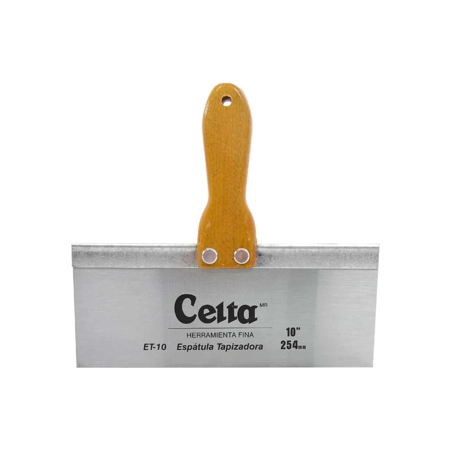 Espátula tapicera de 10" diseñada para trabajos de tapicería y carpintería. Su hoja amplia permite aplicar presión uniforme al estirar telas, nivelar superficies o retirar materiales adheridos. El mango de madera proporciona un agarre firme y cómodo para un control preciso durante el uso. Recomendada para profesionales del mueble, restauradores y entusiastas del bricolaje.