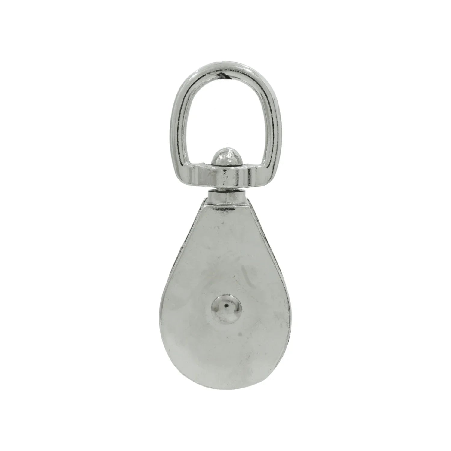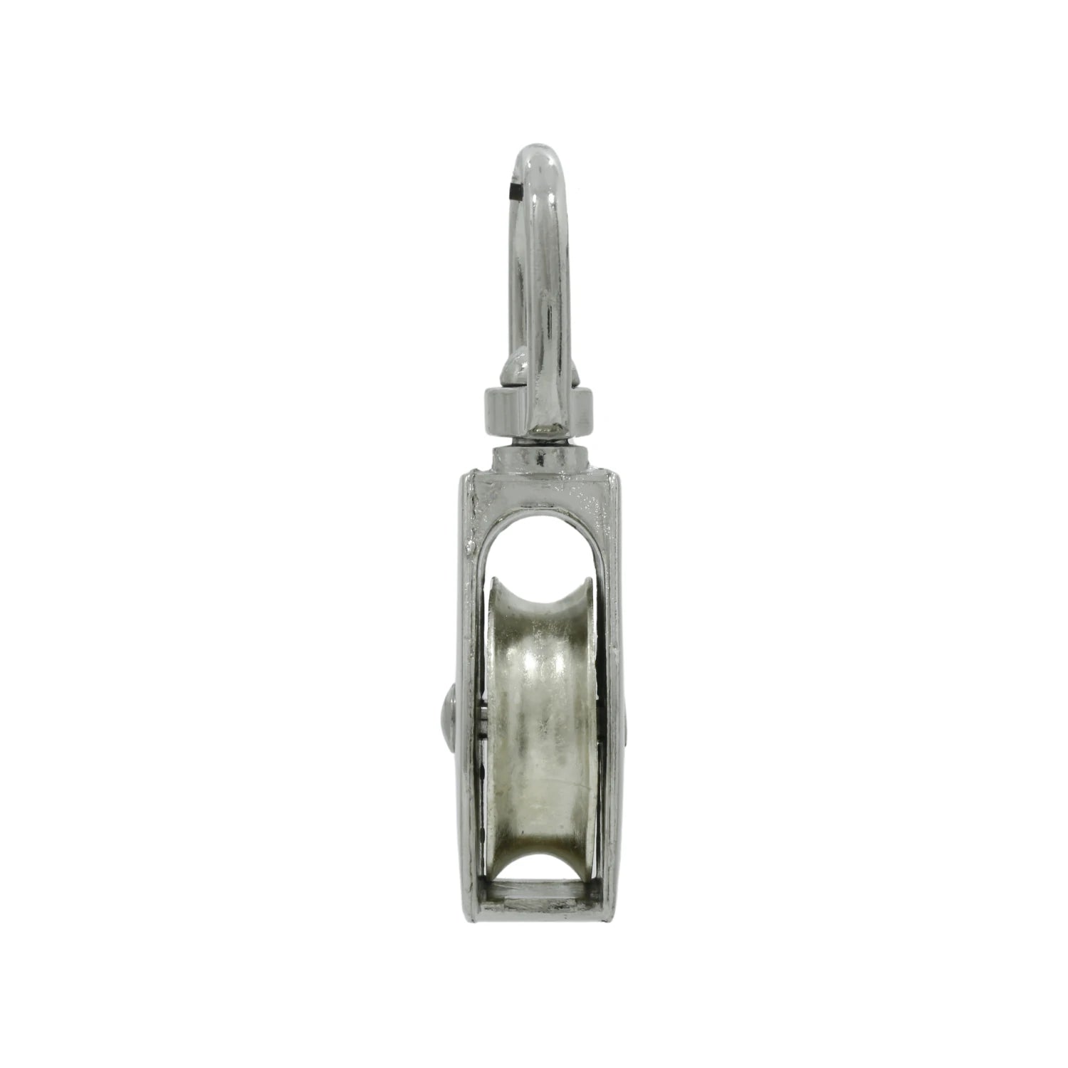 Garrucha para noria 1 1/2pulgada modelo 7752 marca Santul fabricada en aleación de zinc con acabado niquelado ideal para levantar cargas ligeras en sistemas de poleas con diseño compacto y alta resistencia a la corrosión