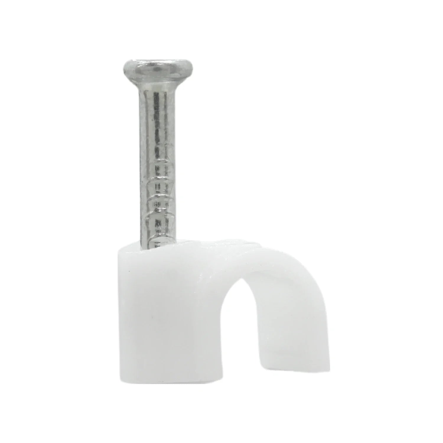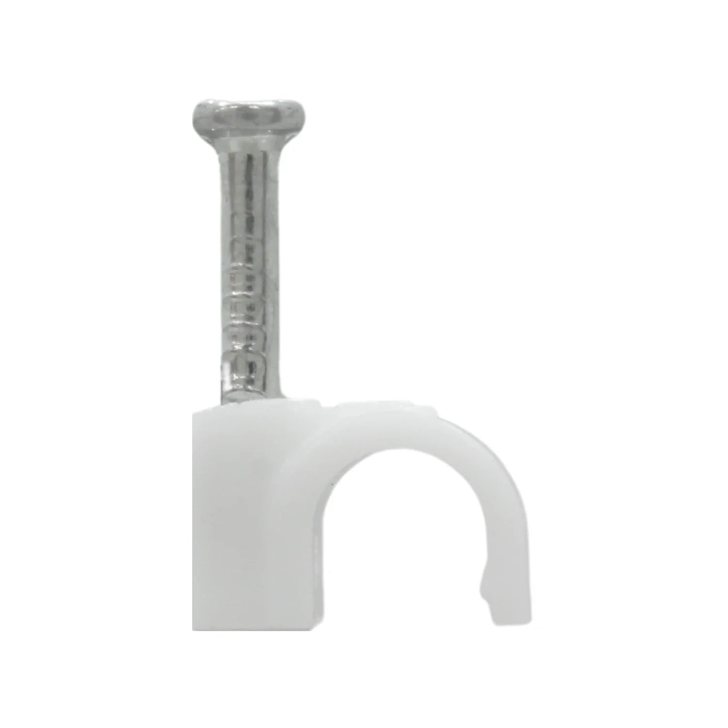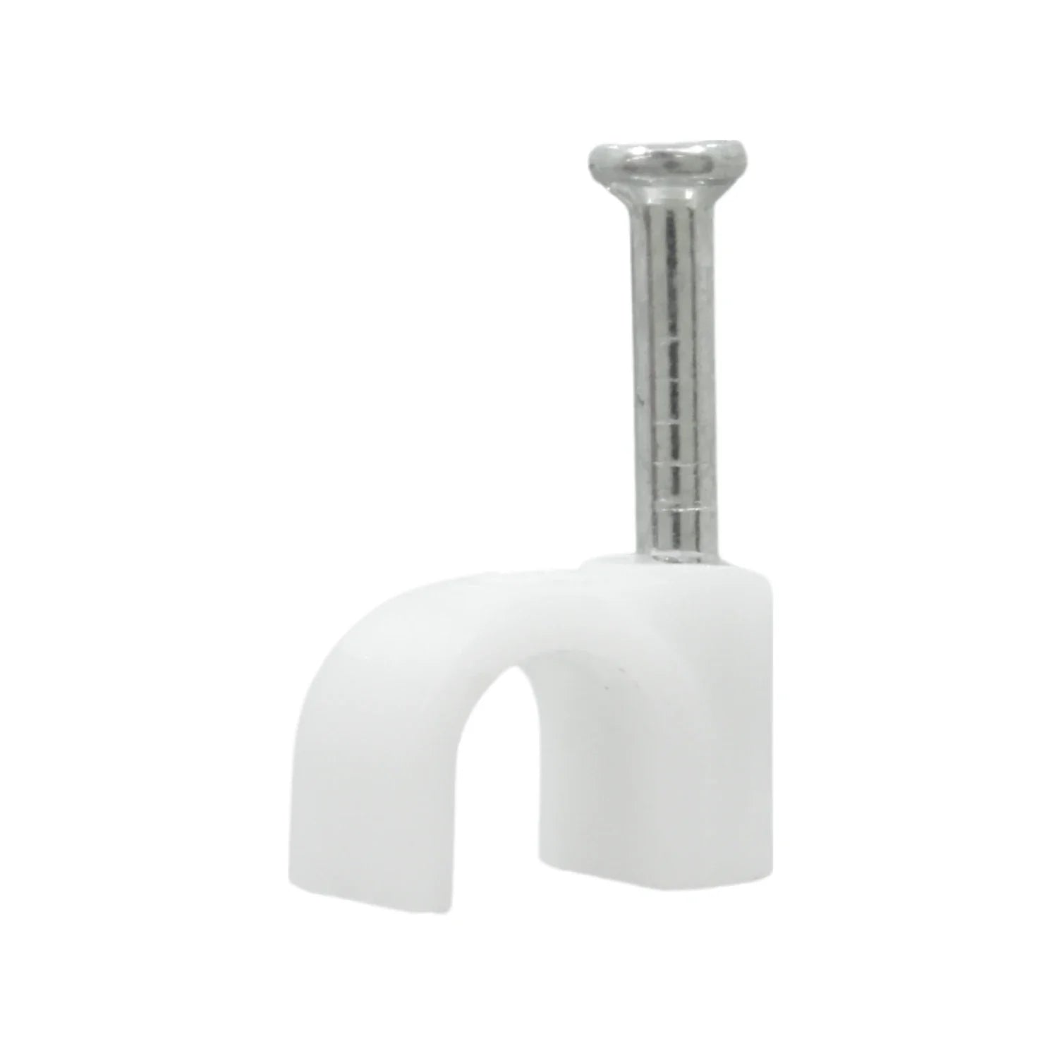 Grapa curva de 5 mm marca Adir modelo 6415 fabricada en plástico blanco con clavo metálico para fijación en muros. Ideal para sujetar cables redondos como coaxiales o telefónicos sin dañar el aislamiento.