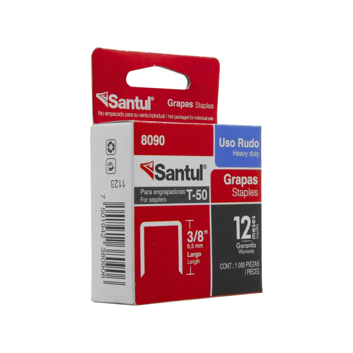 Paquete de 1000 grapas metálicas Santul modelo 8090 tipo T-50 con longitud de 3/8" (10 mm) fabricadas en acero galvanizado para aplicaciones de trabajo pesado como tapicería, aislamiento, colocación de alfombras y fijaciones en madera. Compatibles con engrapadoras manuales tipo T-50.