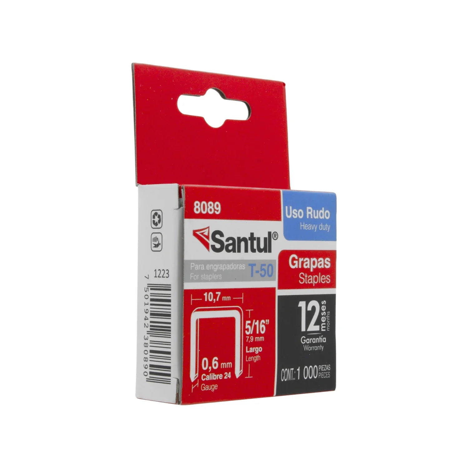 Paquete de 1000 grapas metálicas Santul modelo 8089 tipo T-50 con longitud de 5/16" (8 mm) fabricadas en acero galvanizado para aplicaciones de trabajo pesado como tapicería, aislamiento, colocación de alfombras y fijaciones en madera. Compatibles con engrapadoras manuales tipo T-50.