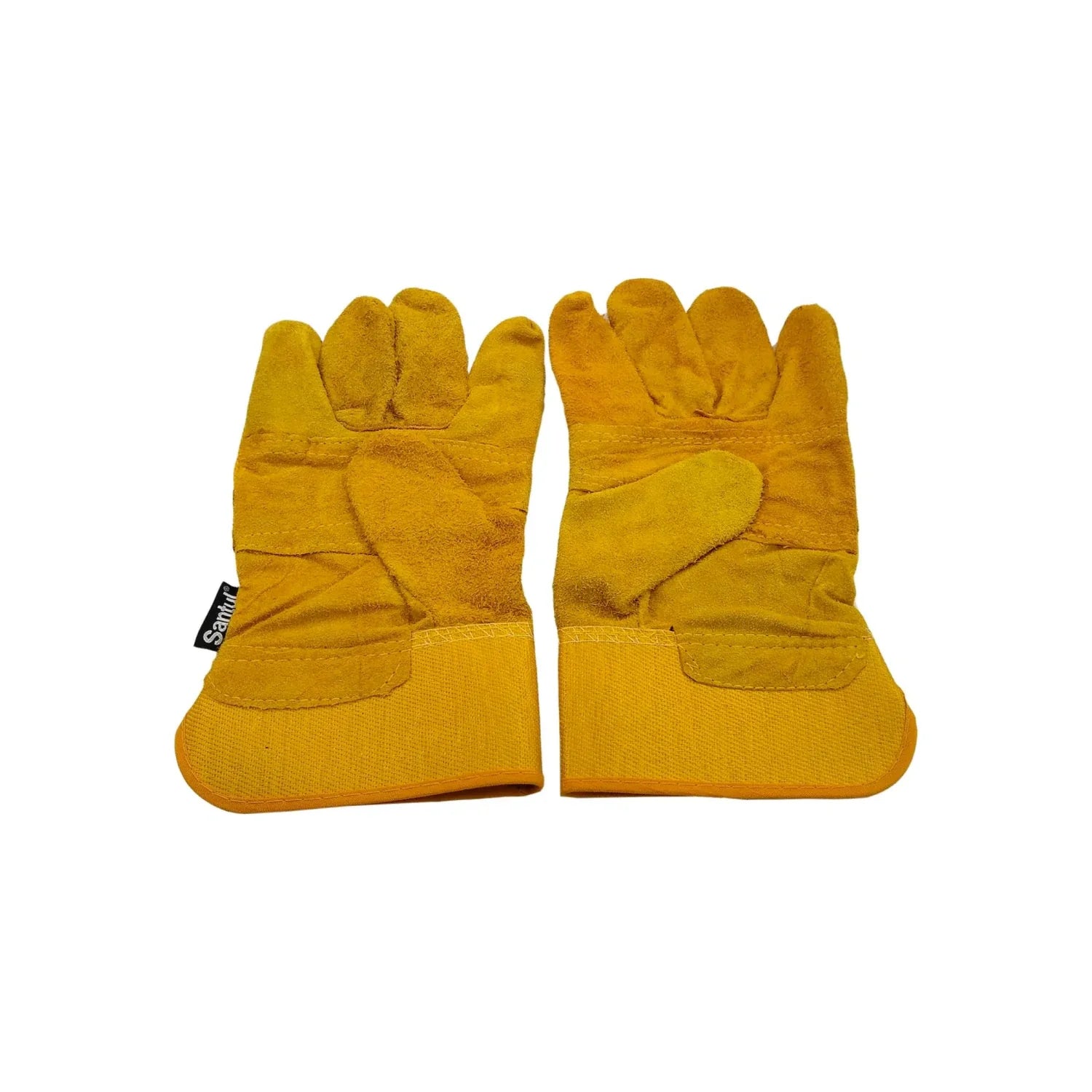 Guante Santul modelo 8414, unitalla, fabricado con palma de carnaza natural y dorso de tela tipo loneta. Su diseño corto permite mayor movilidad y ventilación, ideal para tareas de mantenimiento, carga ligera y trabajos generales en obra. Ligero, cómodo y resistente al desgaste.
