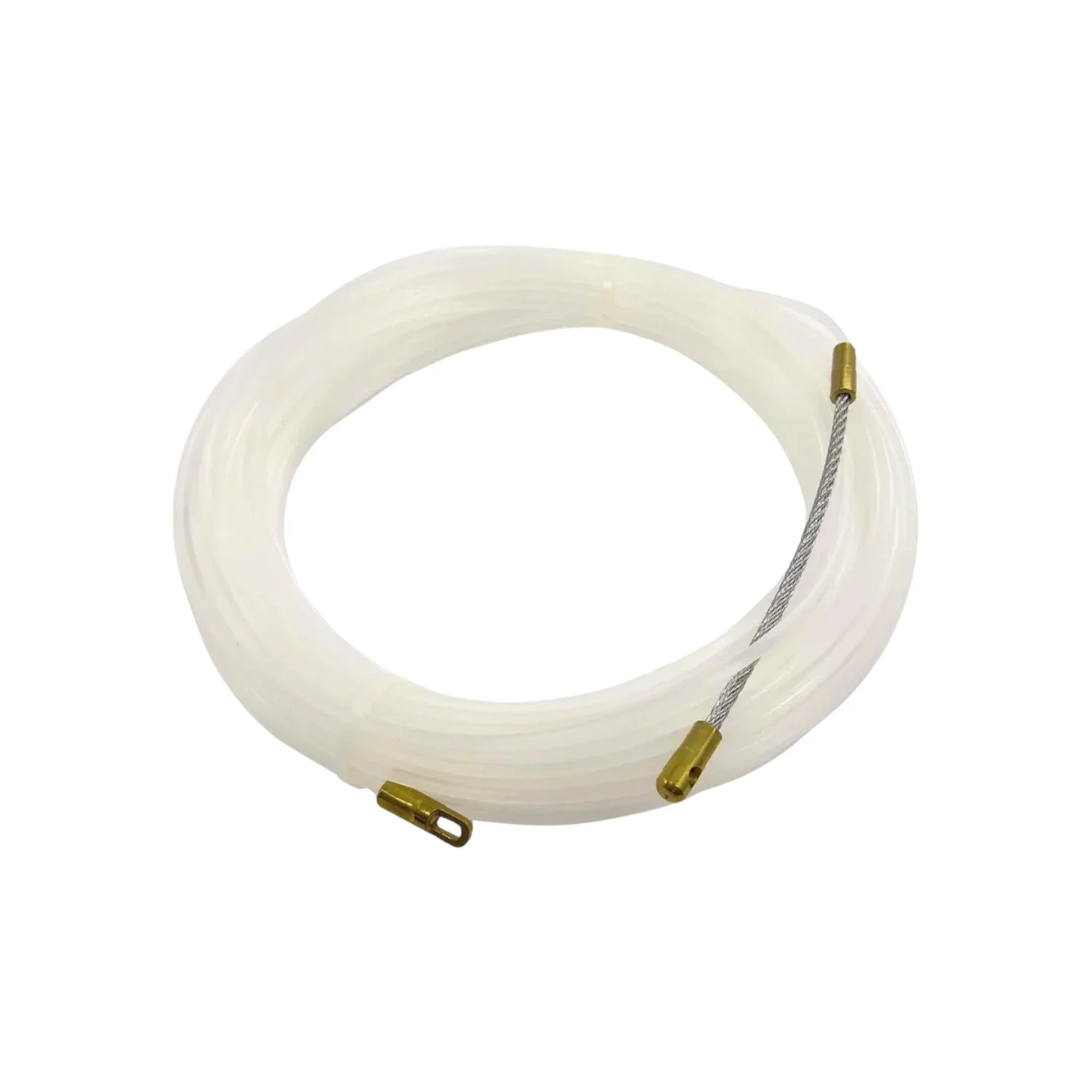 Guía para cableado de 20 metros fabricada en nylon monofilamento virgen 6/6 con cable interno de acero galvanizado y punteras metálicas, diseñada para instalaciones eléctricas en ductos, poliductos o canalizaciones.