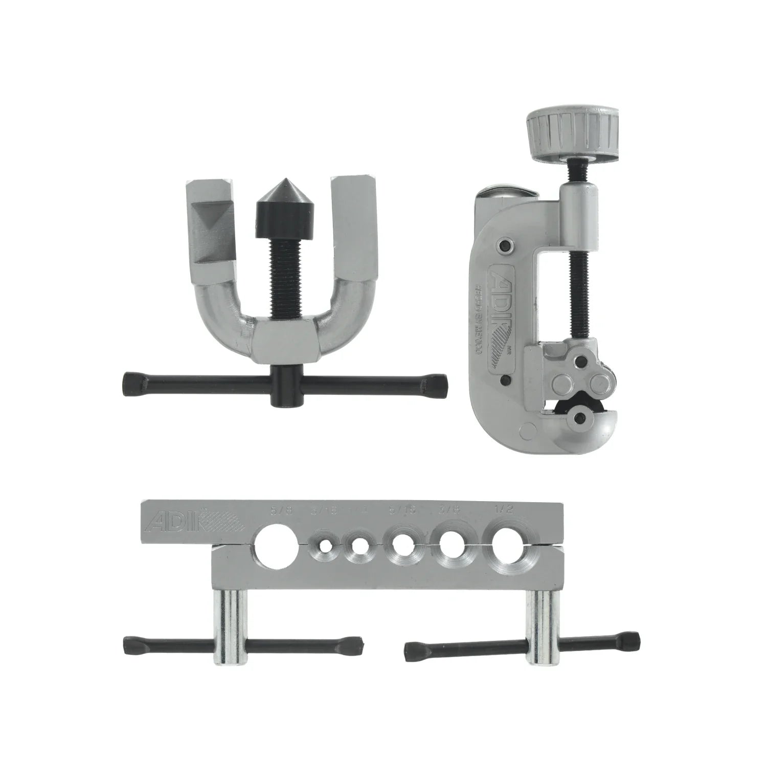Juego avellanador y cortador de tubo Adir 395 diseñado para trabajos de precisión en metal, ideal para cortar y avellanar tubos de cobre, aluminio, latón y fierro, facilitando la instalación de accesorios y conexiones.