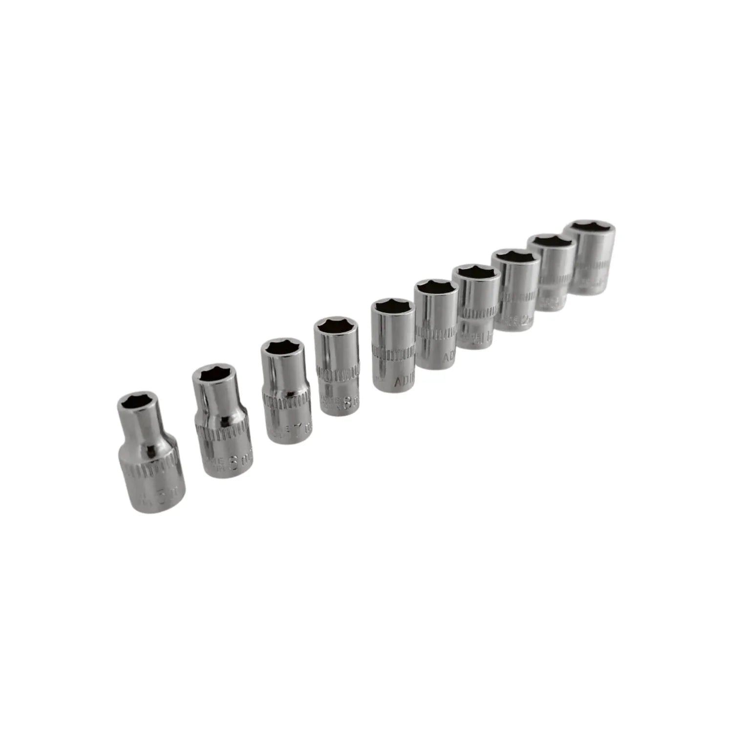 Juego de dados milimétricos 1/4" 10 piezas Adir 11529 fabricado en acero al cromo vanadio con acabado pulido espejo, ideal para trabajos de mecánica y mantenimiento, amplia variedad de aplicaciones.