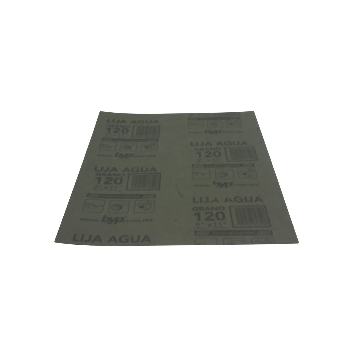 Lija de agua Byp modelo LAG120 grano 120 fabricada con carburo de silicio sobre papel impermeable tipo Kraft, diseñada para lijado intermedio en superficies como vidrio, mármol, cerámica, goma, plásticos y fibra de vidrio.