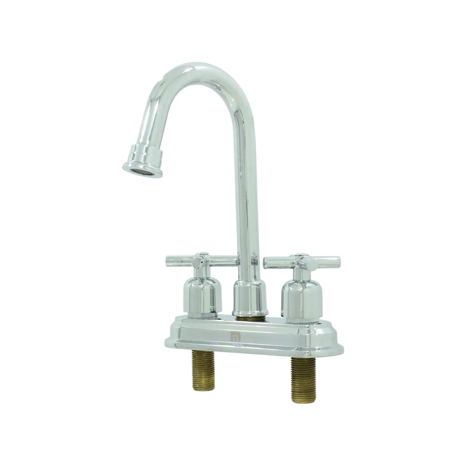 Mezcladora Metalflu 04627 Ebba para lavabo de 4", con cuerpo y vástago de latón, cuello de acero inoxidable tipo bar y cubierta metálica. Manerales metálicos tipo cruveta, acabado cromado brillante y sistema de cierre cerámico de doble comando. Ideal para baños residenciales. Compatible con baja presión.