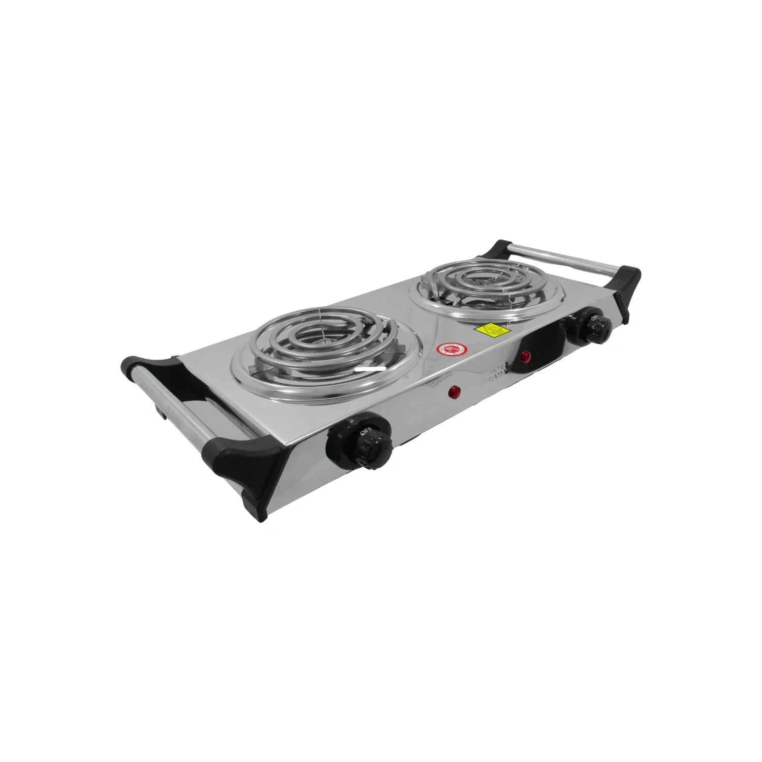 Parrilla eléctrica portátil con cuerpo de acero inoxidable, dos resistencias espiraladas con termostato independiente y asas aislantes, diseñada para cocinas auxiliares que requieren cocción rápida, estética moderna y control preciso de temperatura