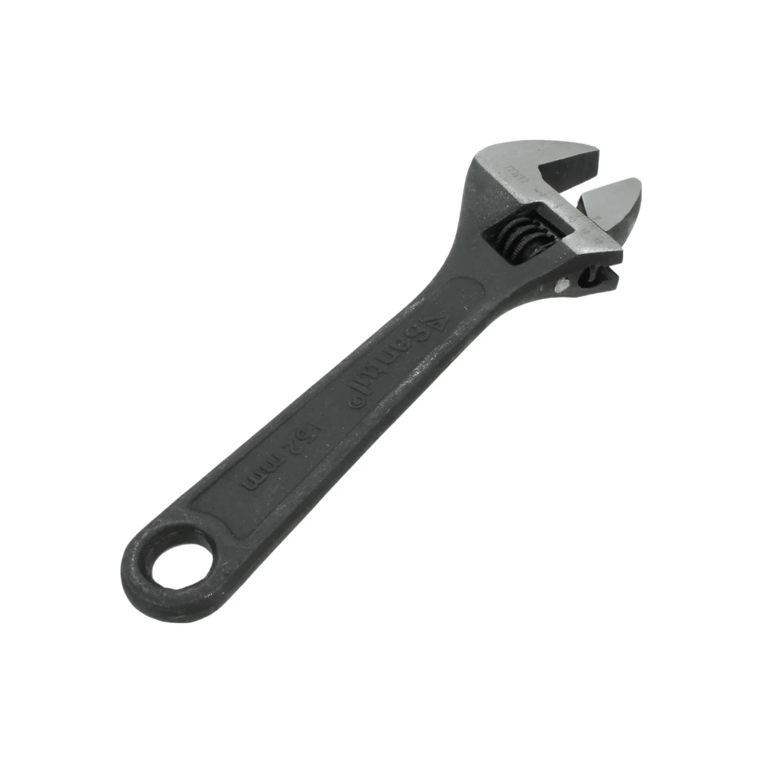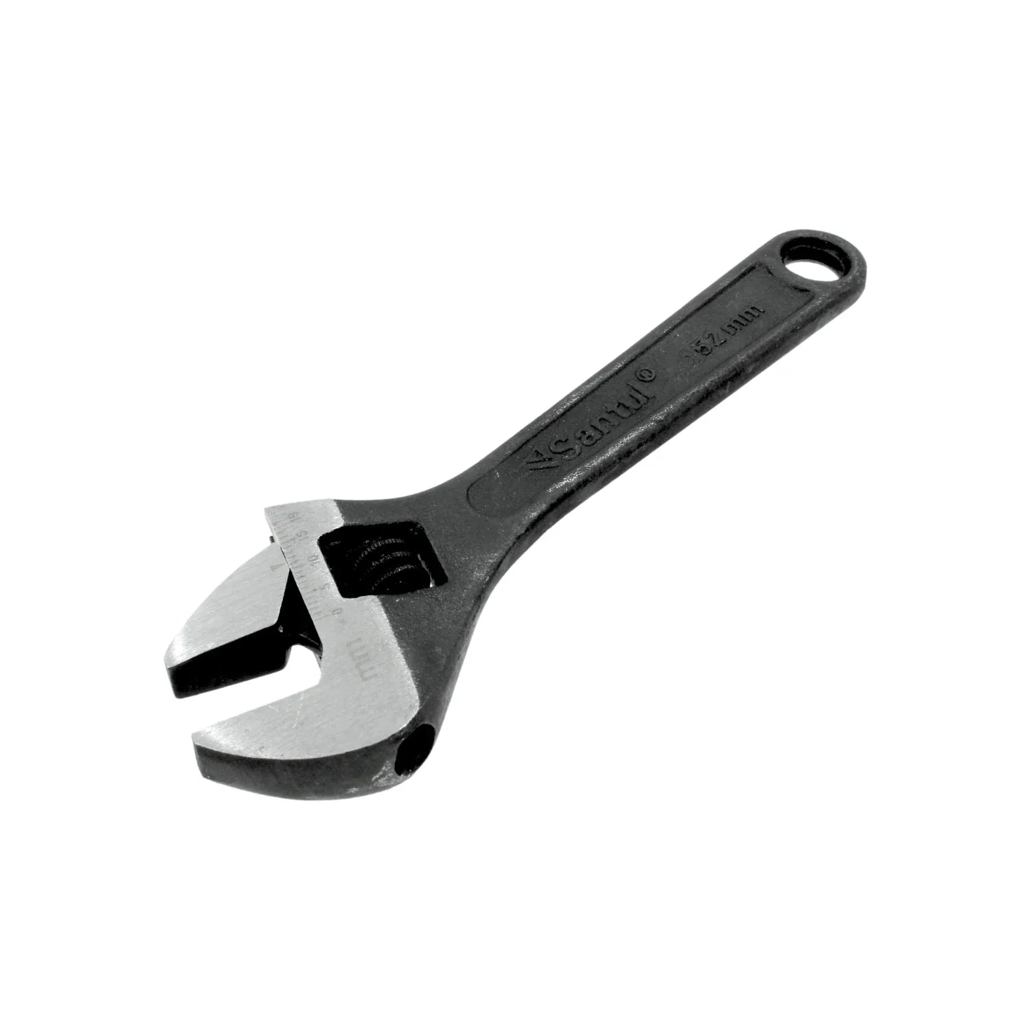 Llave ajustable tipo perico Santul 9203 de 6 pulgadas, fabricada en acero al carbono con acabado pavonado. Su diseño compacto y mordazas forjadas permiten ajustar tuercas, tornillos y tubos con precisión en espacios reducidos. Apertura máxima de 19 mm con anillo de ajuste integrado al mango. Ideal para plomería, herrería y mantenimiento doméstico.
