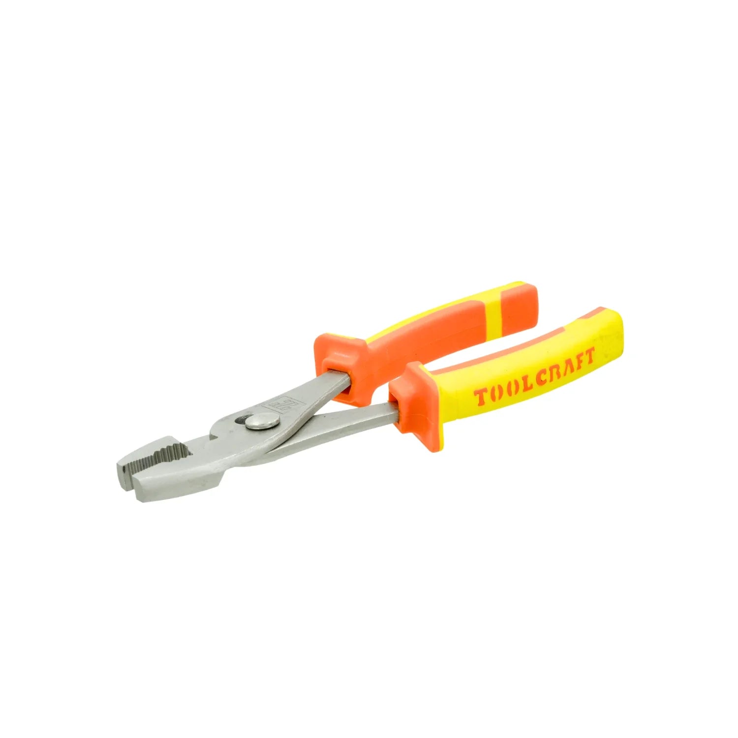 Pinza de chofer Toolcraft TC6098 de 8 pulgadas con aislamiento certificado hasta 1000 V, diseñada para trabajos eléctricos que requieren máxima seguridad, firmeza y control en maniobras de sujeción y corte.