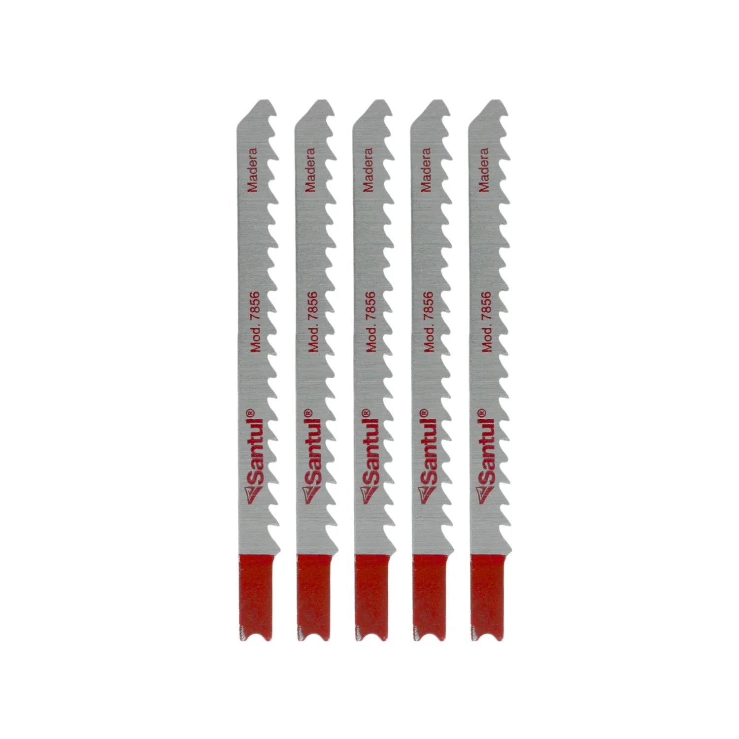 El Juego de 5 seguetas para caladora Santul 7856 es una herramienta esencial para realizar cortes rectos y precisos en madera maciza gruesa y PVC. Su diseño con zanco tipo "U" y 6 dientes por pulgada permite un corte eficiente y limpio, ideal para trabajos de bricolaje y profesionales.