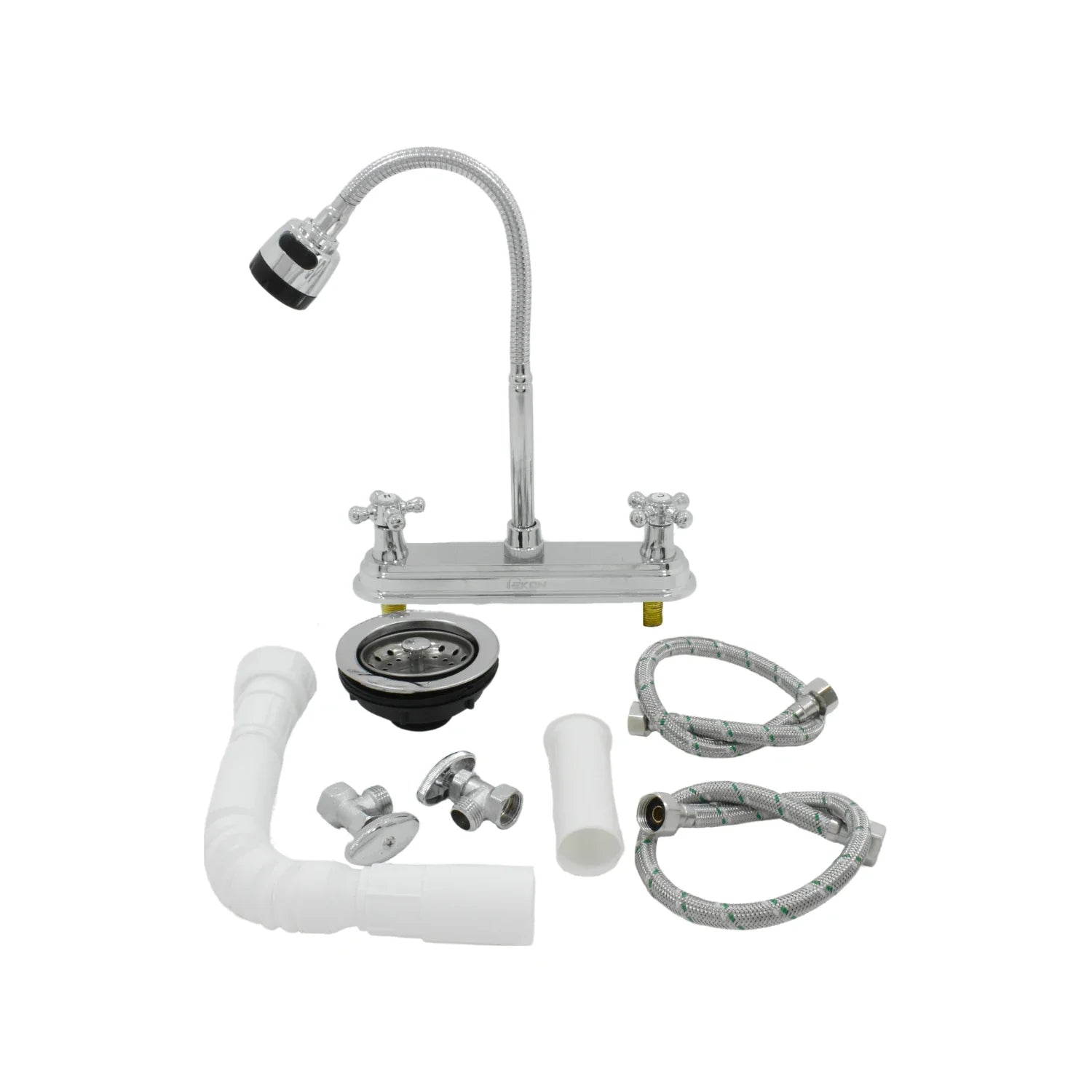 La tarja empotrable Ekon 62331/62007 mide 80 cm × 50 cm y tiene escurridor en el lado derecho. Fabricada en acero inoxidable tipo 204 con acabado satinado altamente pulido y profundidad de 15 cm, incluye mezcladora tipo cisne con válvulas, contracanasta, mangueras, céspol y herrajes para instalación completa.